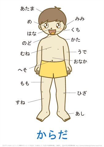 ・先日、田植えの後、年長が体を拭く様子を見ていたら、 足から拭いたり、背中は拭かない子、ボーッと立っている子など見て??? ・きっと大人がバスタオルで拭いてあげているのかしら?...と心配になりました。タオル1枚で拭き上げるこつを年長にタオル体操をしながら伝えました。 ◎ 頭から拭き、最後に足まで♪ からだの なまえを おぼえよう!!